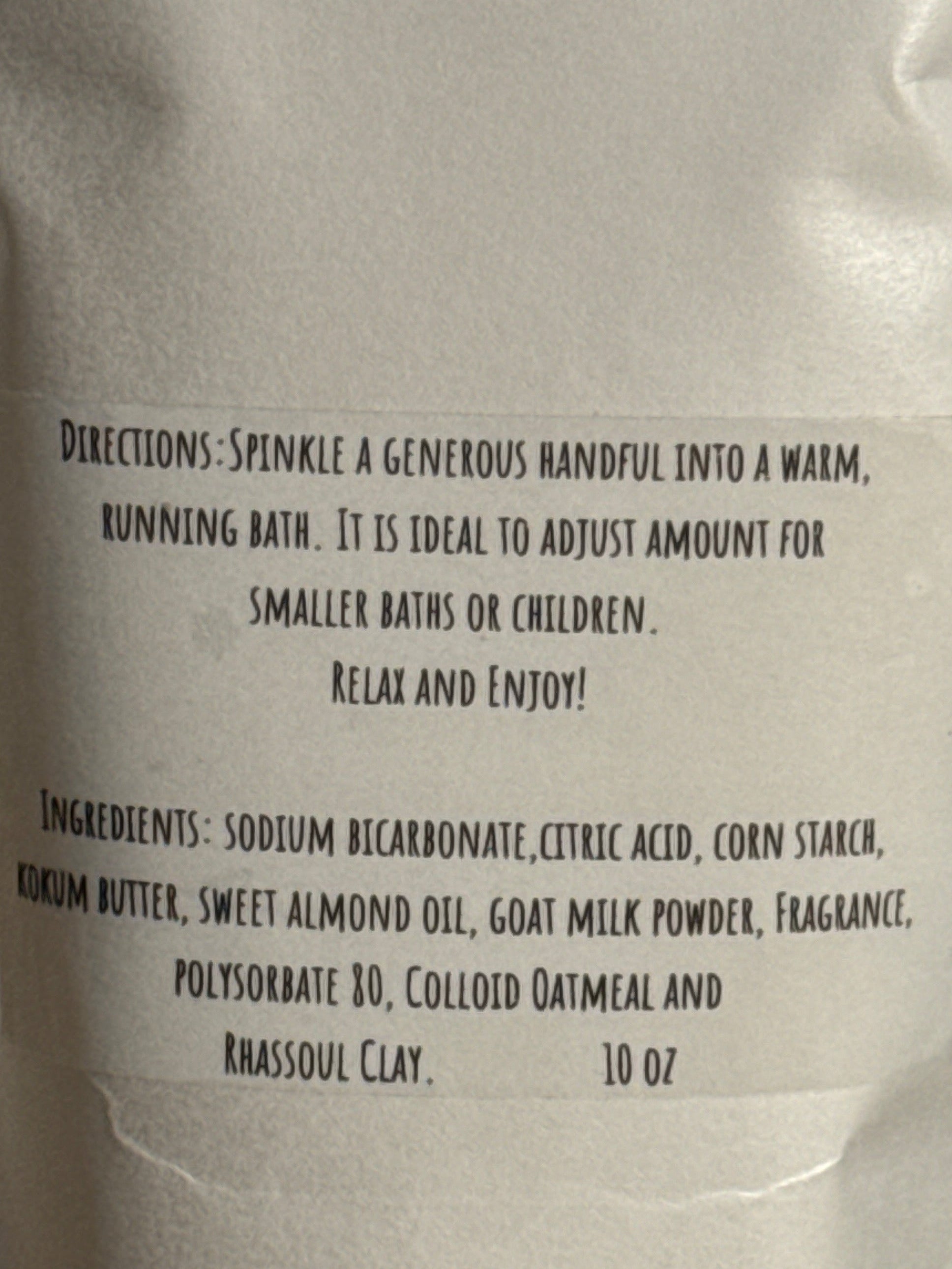 Ingredients: Baking Soda, Citric Acid, Corn Starch, Sweet Almond Oil, Kokum Butter, Goat Milk Powder, Fragrance and Polysorbate 80.