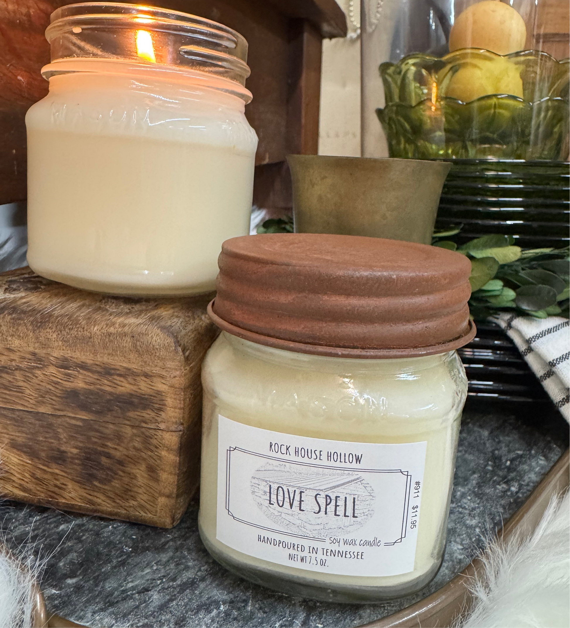 Experience the captivating scent of Love Spell. With top notes of fresh peach and red apple, and middle notes of lilac, jasmine, and lily-of-the-valley, this soy candle creates a warm and comforting atmosphere. The base of white woods, tamarind, and musk adds a touch of sophistication to your space. Enjoy up to 30 hours of burn time.