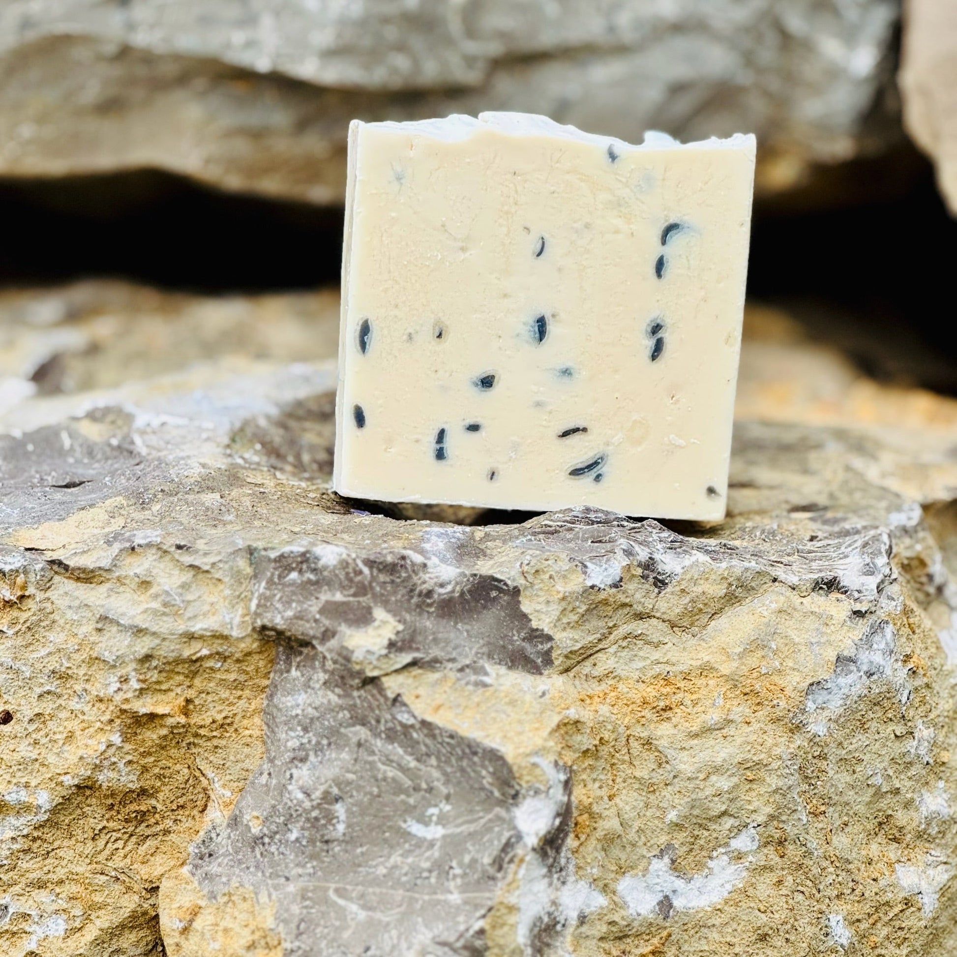 Ingredients: Olive Oil, Palm Oil, Coconut Oil, Raw Goat Milk, Distilled Water, *Sodium Hydroxide, Cocoa Butter, Peppermint and Tea Tree Essential Oils, Titanium Dioxide, Activated Charcoal.